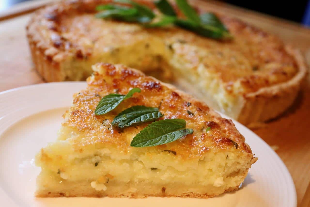 3. In a bowl, combine ricotta, eggs, sugar, lemon zest, mint, and aniseed until smooth. Pour this mixture over the crust.
