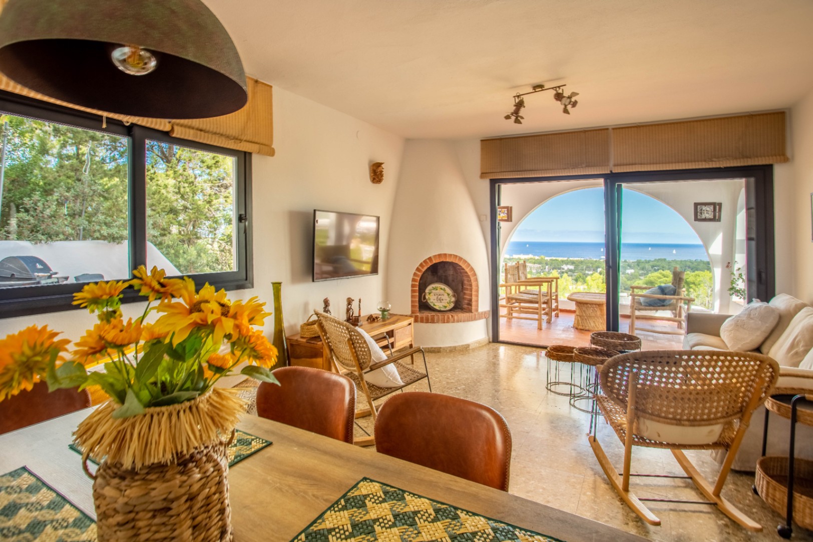 It’s all in the details here: locally made bath products, a full SONOS setup, streaming options that don’t feel like an afterthought. The villa’s just 4 km from the beach, close enough to Ibiza Town and Santa Gertrudis for outings but far enough to keep the peace.