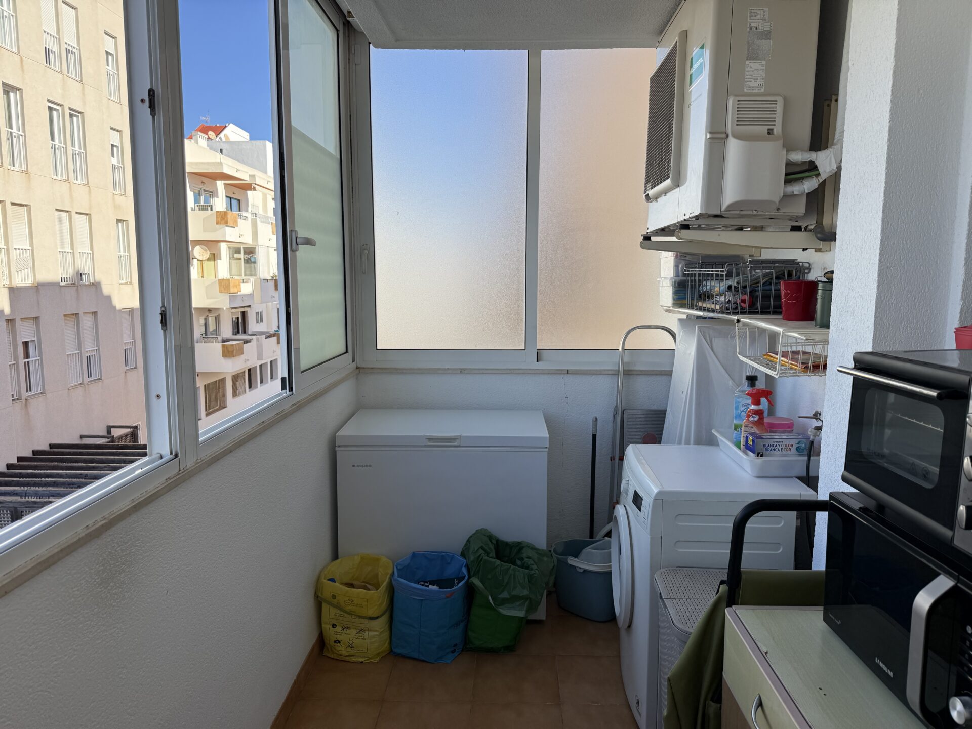 The interior features a generous and well-organised layout, including a spacious living-dining area and a fully equipped kitchen with a 12 m² utility space. The property offers three double bedrooms and two full bathrooms, along with a welcoming entrance hall with built-in wardrobe that enhances daily comfort. The sunny balcony, accessed from the living area, extends the indoor space and allows for year-round enjoyment of the Mediterranean climate.