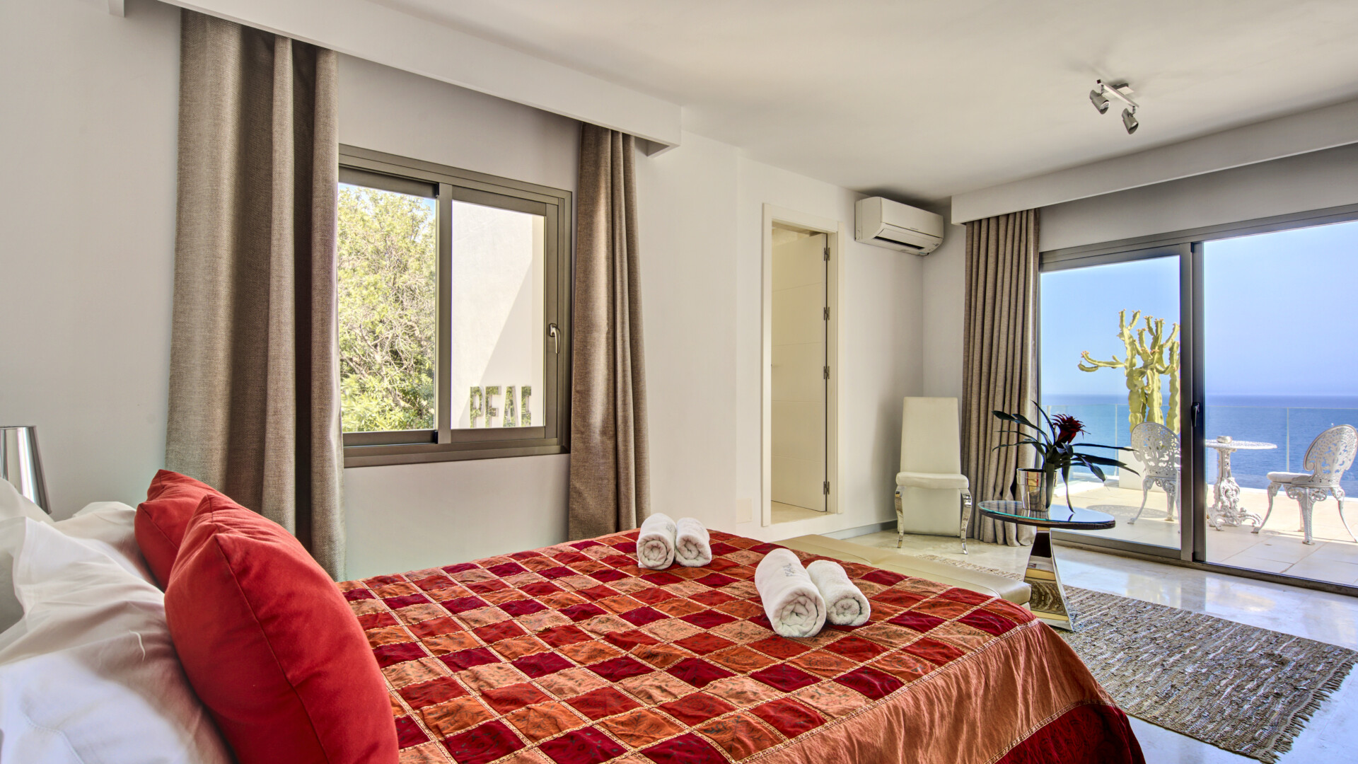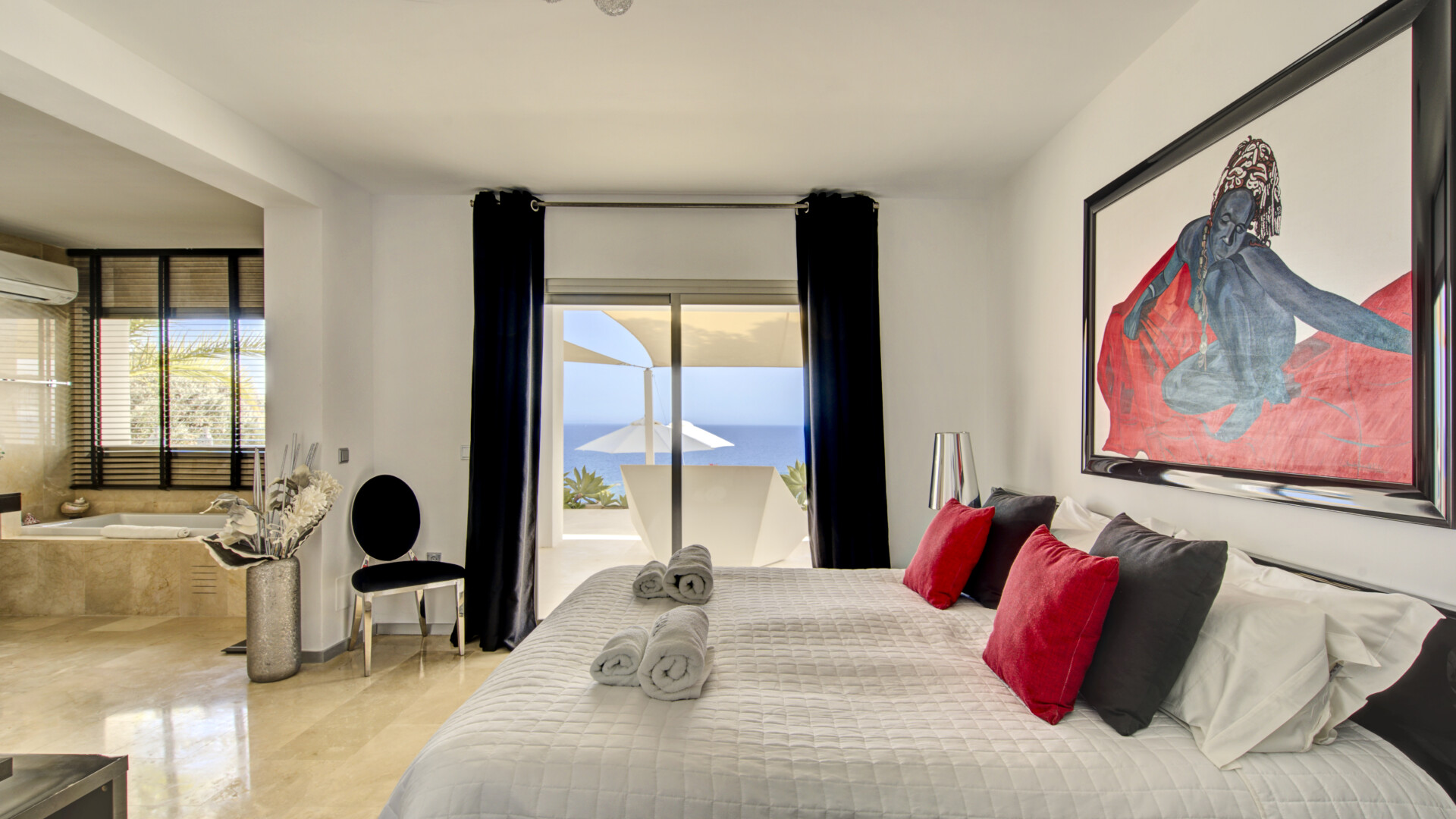 The main house features spacious interiors opening onto terraces with sea views. The living and dining areas connect to a fully equipped kitchen. The master bedroom includes an en-suite bathroom with jacuzzi and shared terrace, while two additional double bedrooms have private bathrooms and sea-view terraces.