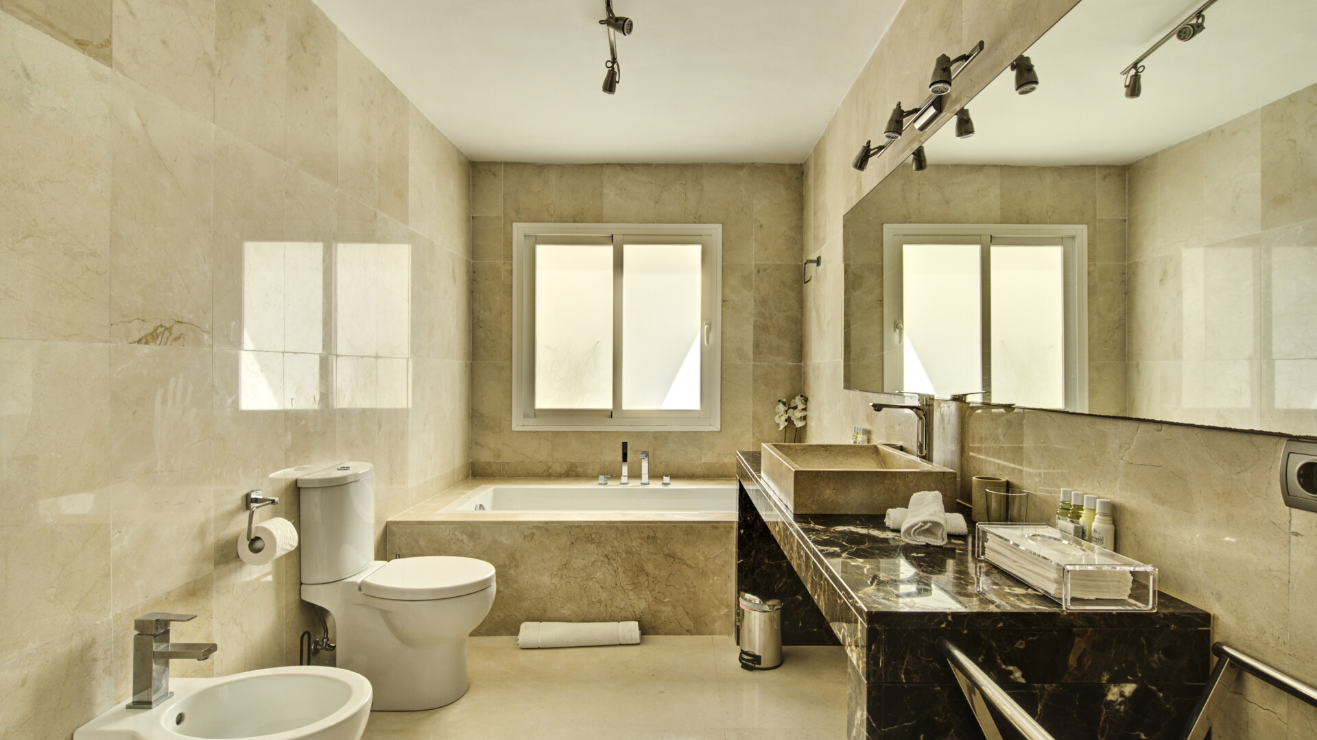 Three further double bedrooms are located on the lower level with private entrances and en-suite bathrooms, ensuring privacy and comfort for guests or large families.
